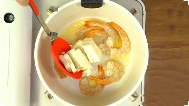 4、看到蝦的顏色變紅瞭,把豆腐也放進去,加一大勺料酒。
