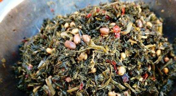 首先雪裡蕻洗凈晾幹,撒入精鹽揉勻醃漬10天以上醃漬成雪裡蕻咸菜。黃豆淘洗幹凈後用清水浸泡十數小時,直至泡至黃豆鼓脹。準備好所需的香料,適當的放點桂皮之類的香料。香料與幹辣椒可根據喜好酌情增減。醃漬好的雪裡蕻咸菜用清水淘洗幹凈,攥凈水分後切成小段。炒鍋裡倒入油,放入準備好的香料、辣椒段、生薑,小火炸出香辣味。倒入雪裡蕻咸菜段、泡好的黃豆大火翻炒。炒至雪裡蕻顏色油亮後盛到砂鍋裡,調入醬油,倒入足量的清水。開大火煮開後,改小火煨燉約1.5小時,燉至沒有湯汁,雪裡蕻與黃豆綿軟,香味濃鬱即可。烀雪菜黃豆。這菜適合拌面條吃,煮好的手搟面拌上一小勺烀雪菜,拌勻瞭比肉醬澆頭還香。