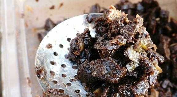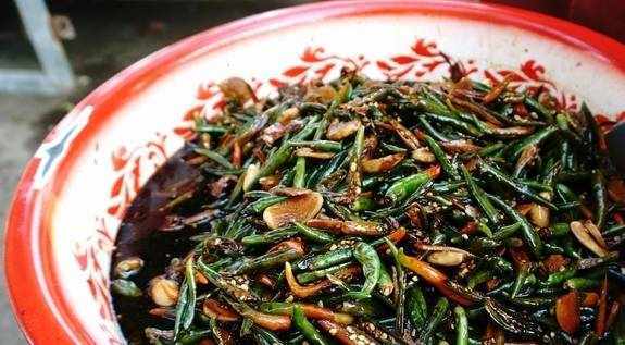 制作醬豆的過程俗稱為“曬醬豆”,一個“曬”字道出瞭制作醬豆的秘笈。選好的黃豆在篩子裡細細篩上幾遍,然後倒入簸箕簸瞭又簸,簸出來的浮土在空氣中久久不散,瑣碎的豆葉和凌亂的草梗滑落在地,引來咯咯亂叫的母雞爭相啄食。醬豆子,老人說:“這是改良後的做法,和以前的不同,黃豆煮熟後用辣醬拌勻醃上七八天就可以”。裹滿辣醬的黃豆聞著噴香,看著就想吃一點嘗嘗。