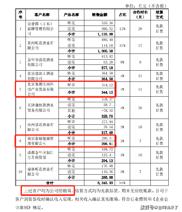 在2022年,這兩傢經銷商總計貢獻銷售額640.73萬元,且全部為聽花酒進貨款。