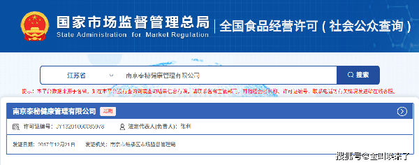 據天眼查,南京泰秘健康管理有限公司的法人為張利,網絡有公開資料顯示其曾就職於鴻茅藥酒。然而經“國傢市場監督管理總局”網站查詢,該公司的食品經營許可證已於2022年12月20日到期,且至今未延續。同時,也尚未在南京市市場監督管理局進行“僅銷售預包裝食品備案”。