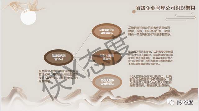省級企業管理公司由品牌銷售公司戰略管理人(總公司)、發起人、合夥人組成。總公司對省級運用公司參股、控股,但不參與分紅,必須具有一票否決權和67%股東投票權,發起人投資30萬元認購資金(地區不同,認購資金也不同,按照比例出資控股21%),合夥人可設立10個,10人投資100萬元認購資金,認購45%的股權,成為該公司的合夥經營人和服務管理者。省級企業管理公司成立後,可獲得推廣權,可招募所轄區域內市級代理經銷商(市級代理經銷商也需要有辦公場所),省級企業管理公司所轄區市場內產品每銷售一瓶酒,可獲得3元的銷售營銷費用返款,每贈送一瓶酒,還可以獲得3元的贈送營銷費用獎勵,以及公司股權釋放所產生的價值獎勵,股權溢價所產生的價值獎勵。