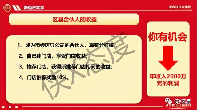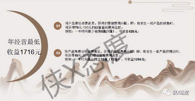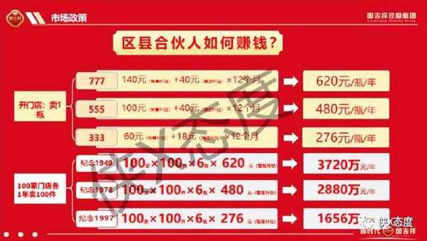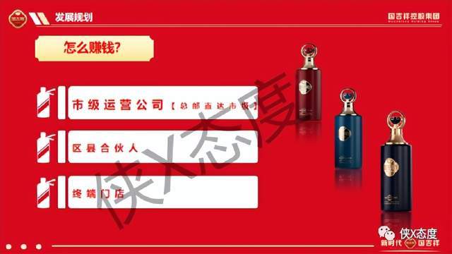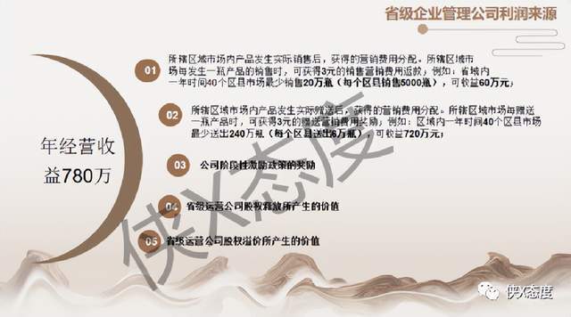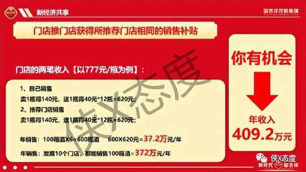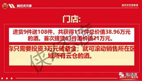 通過查閱相關課件PPT我們瞭解到,1.0版本與2.0版本的資料不同的是酒水價格分別是333元、555元、777元,並設置瞭終端門店、區縣合夥人、市級運營中心三個等級,所享受權益與2.0版本別無二致,此處不再對模式進行過多贅述,接下來配合幾張宣傳圖文供大傢參考: