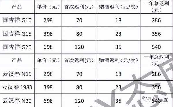目前該平臺銷售兩種品牌酒水,分別是“國吉祥”、“雲漢春”,價格分別是298元/瓶、398元/瓶、698元/瓶,全部施行買1送12政策,實際每瓶酒水價格從22.5元--53.7元不等。