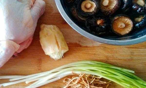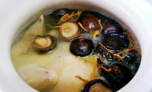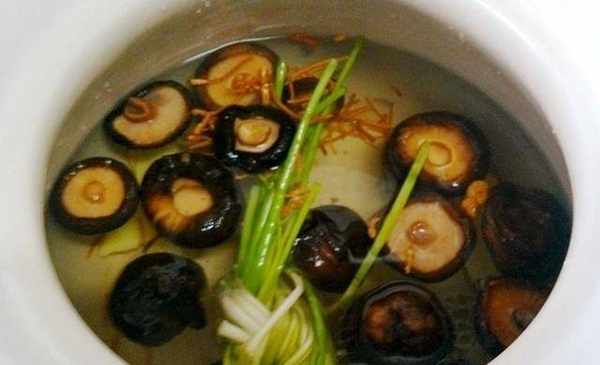 【配料】:幹香菇30克、小蔥一小把、蟲草花5克、生薑一塊、鹽適量、花雕酒適量