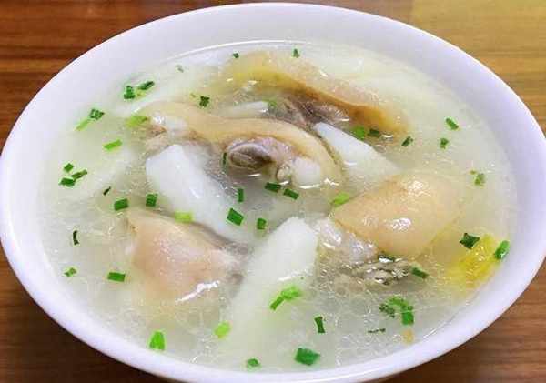 4、加山藥、鹽再煮10分鐘,加入雞精、蔥花即可。