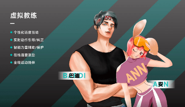 IM-BODY智能力量健身鏡首創IAC智能算法,可模擬健身房體測,針對胸、肩、背、腿四大肌群進行力量測試並生成報告,給出訓練建議並推薦相應課程。還為用戶配備瞭Bardi和Ann兩位虛擬教練,可支持個性化語音互動、實時動作引導/糾正、智能力量保護、在線語音激勵、全程運動陪伴等多種功能。