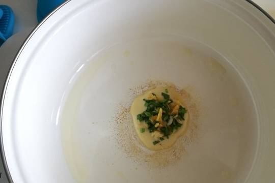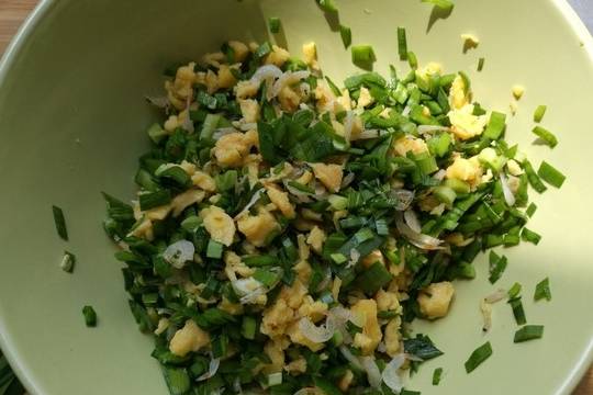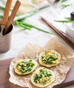 7.鍋中放少許油,小火,玉米面用勺子盛出少許,攤成小餅,表面放入混合好的韭菜雞蛋餡,烙熟即可,玉米餅底部有鍋巴口感會更好