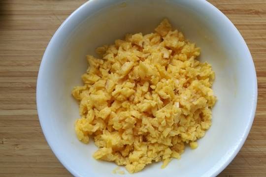5.雞蛋炒熟後,用刀切成小塊,備用