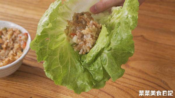澆汁土豆泥拌入米飯、雞蛋醬,再用大菜葉子一裹。
