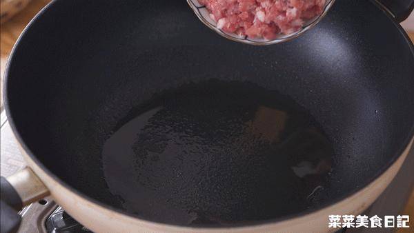 3.起鍋加油,放入豬肉糜炒散,煸出油脂;加入蒜末炒香,加2小勺料酒、2小勺生抽、1小勺老抽翻炒均勻,盛出