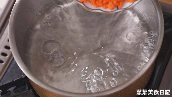 1.鍋中加400g清水煮開,加入胡蘿卜碎、金針菇碎、香幹塊