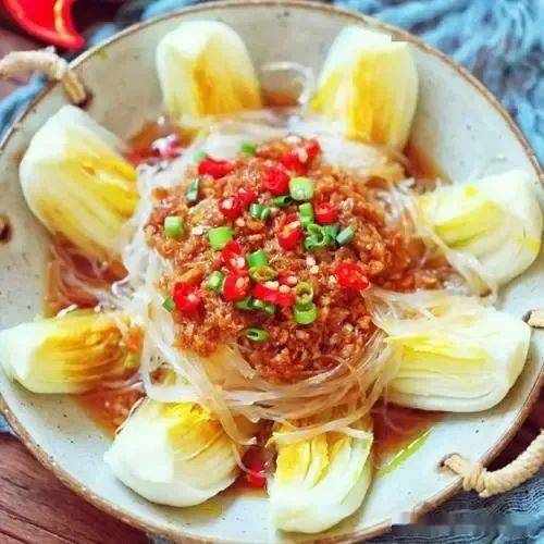 1)娃娃菜瀝水,將菜整株分切,米粉浸泡開水2分鐘,然後兩個一起裝盤隔水蒸6-8分鐘至熟;
