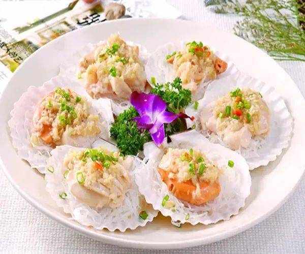 2)將爆香的蒜末與另一半生蒜末調入少許鹽,雞精混勻備用;洗幹凈的扇貝用刀剖出,將米粉剪成小段,然後鋪在貝殼裡,均勻的撒一點點兒細鹽。