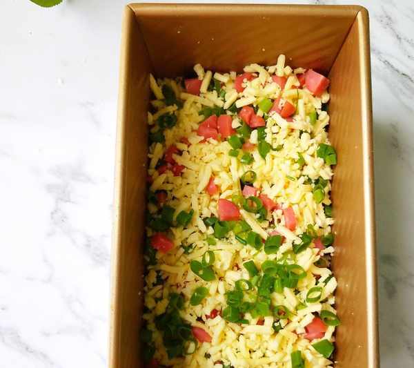 將提前準備好的配料拿出來撒在表面,小香蔥切成小段、香腸也切成小粒,馬蘇裡拉芝士提前拿出來解凍,撒一層馬蘇裡拉芝士、再撒小香蔥和香腸,撒多一點才能有拉絲的效果。