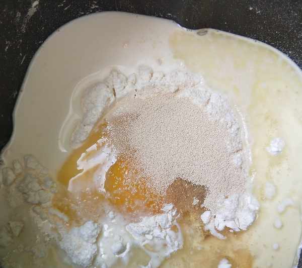 將雞蛋、純牛奶、玉米油、面粉、鹽、酵母、白糖全部放入面包桶,先放液體再放其他食材,開啟揉面模式,揉面30分鐘,揉成光滑的面團。