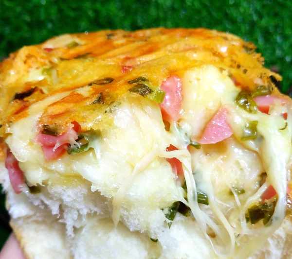 2.撒馬蘇裡拉芝士和香蔥、香腸要大把往裡撒,越多越好吃;