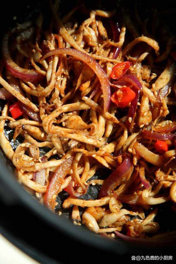 杏鮑菇(3個)300克、洋蔥65克、蒜末8克、油20克、生抽10克、老抽3克、蠔油10克、白芝麻5克、小米椒3克、花椒粉1克、孜然粉2克、辣椒粉2克
