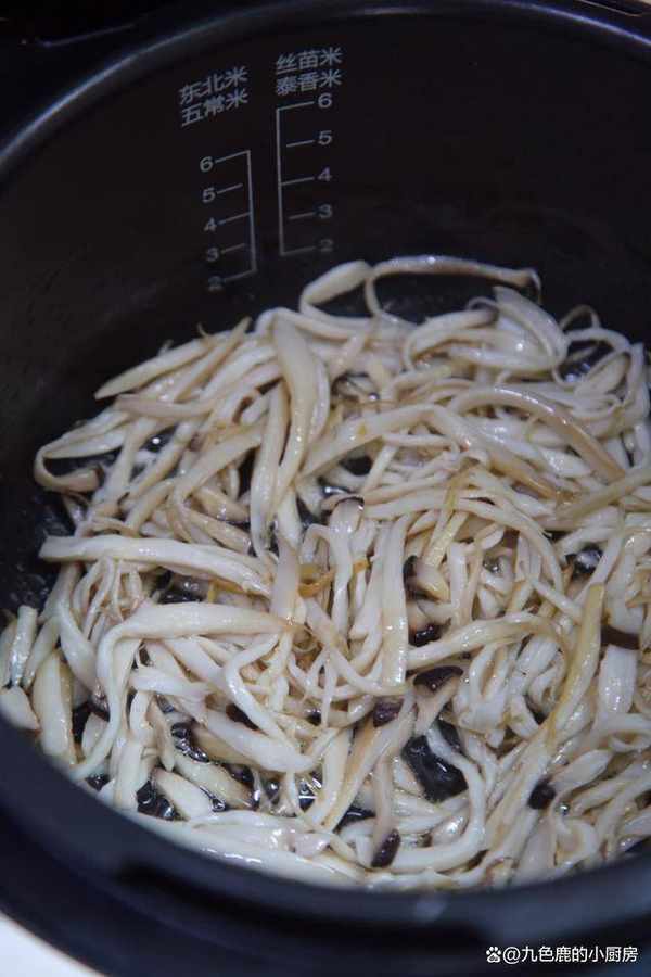 2、料理快鍋加水到絲苗米3水位線,水開後放入杏鮑菇煮2分鐘。