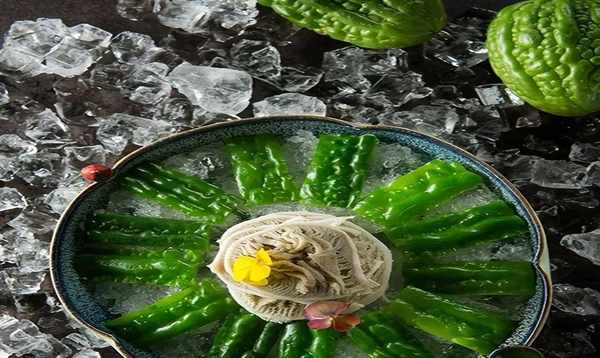 1、將涼瓜洗凈,切成長6.5厘米、寬3厘米的長方塊,汆水30秒,過涼水後瀝幹,放入冰盤中做造型備用;