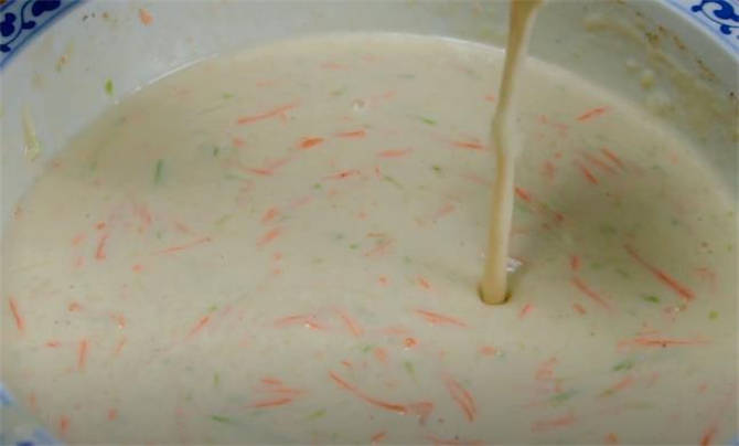 1.做早餐餅當然離不開蔬菜,我擦瞭一些筍瓜還有胡蘿卜,然後倒入適量的面粉,先把面粉攪勻,最好蔬菜都裹上面粉,這樣的狀態最好,攪拌好之後再少量多次的添加清水,攪拌成面糊,加入兩勺鹽調味,一直攪拌成這種流線狀,沒有小顆粒的面糊就可以瞭。