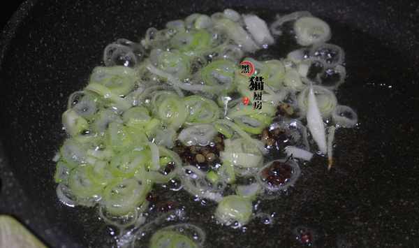 2.熱鍋後倒入小半碗食用油,這油可以是花生油或者其他植物油,把蔥白切碎後放入鍋中,連同花椒粒一起小火微煸出香味。火別太大瞭,否則容易燒出糊味。