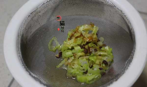 4.把煸出來的花椒蔥油過篩一下,瀝出花椒粒和蔥花,留著這一小半碗油一會用。