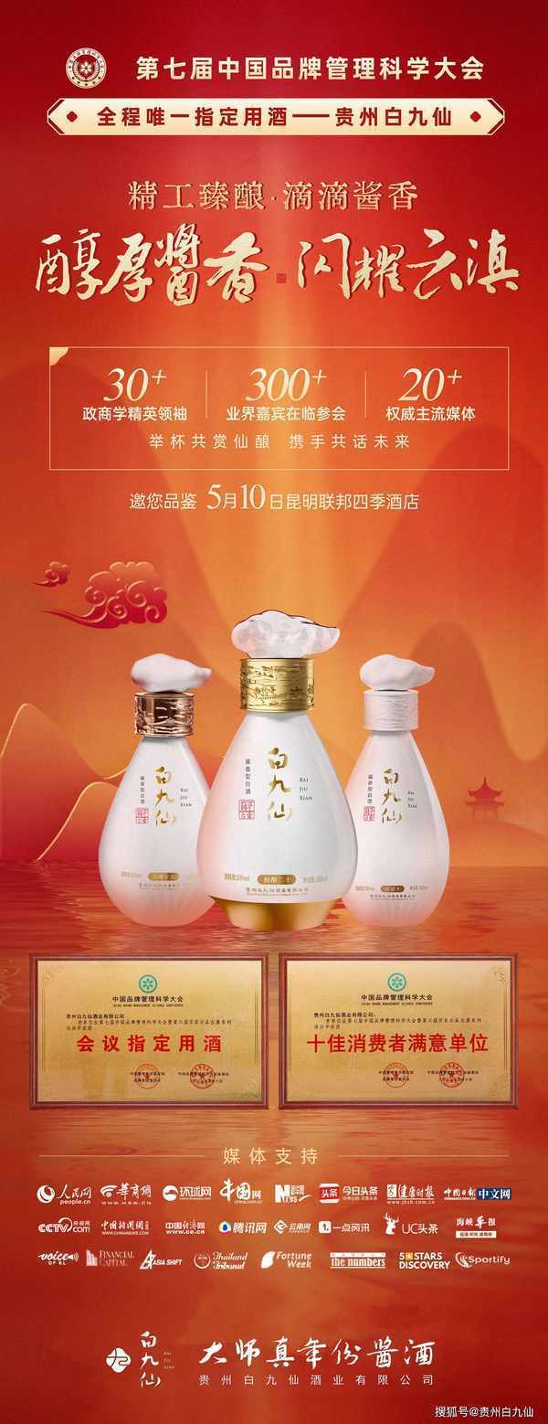 2023年5月10日,由聯合國世界絲路論壇、中國品牌管理科學大會組委會等多傢機構聯合主辦的第七屆中國品牌管理科學大會暨第六屆百縣雲品出滇系列活動在雲南昆明聯邦四季酒店順利召開,貴州白九仙酒業有限公司作為本次會議全程指定用酒,攜手大會共同探討品牌建設與發展。