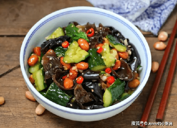 黃瓜、木耳放在一起,再加入蒜末、小米椒、鹽、白糖、生抽、香醋、香油攪拌均勻。