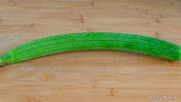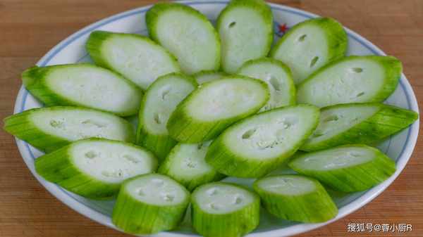 7、這種絲瓜是比較嫩的,外皮不用削皮刀削,直接用刀輕輕的刮掉就行瞭,不用刮的特別幹凈,留一些綠色就可以瞭。去皮後再將絲瓜斜著切片,可以切厚一點,千萬不要太薄瞭,不然絲瓜蒸出來後就看不太明顯瞭。