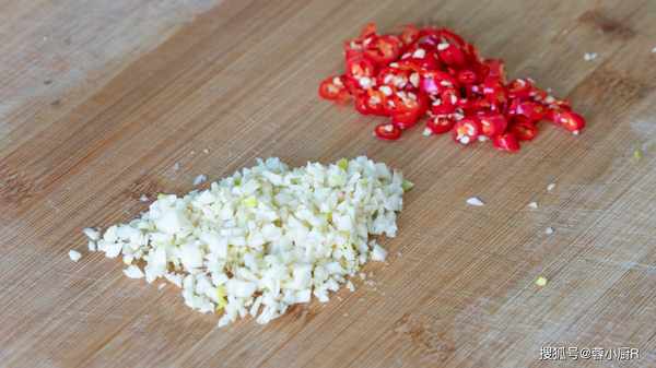 3、這時候來切點小米辣和大蒜,小米辣切圈,大蒜切末。