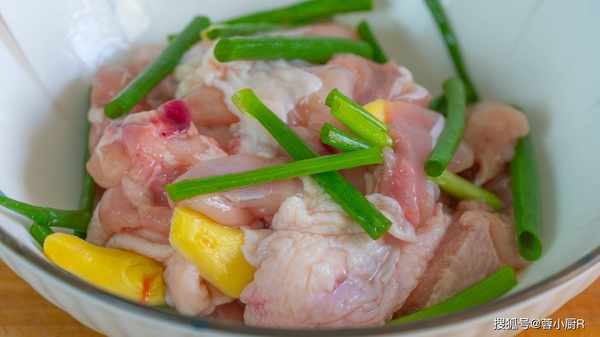 4、處理好的雞腿肉切成大塊兒,然後裝入碗裡開始醃制;加蔥段、薑片、料酒去腥,然後再加鹽、生抽、胡椒粉入個底味,最後加一小勺淀粉和一勺花生油抓拌均勻,接著醃制20分鐘。