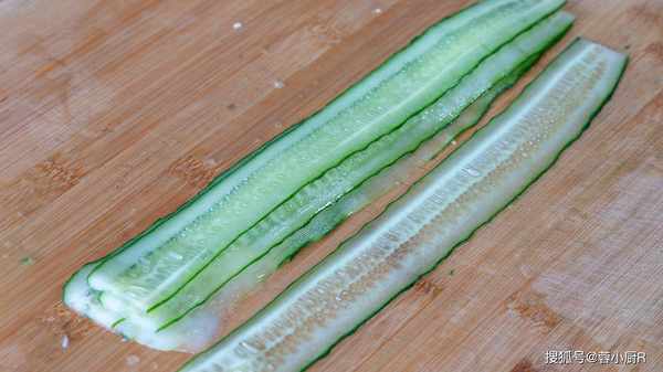 1、黃瓜1根清洗幹凈,從中間一分為二,甪刮皮刀刮成薄薄的黃瓜片。