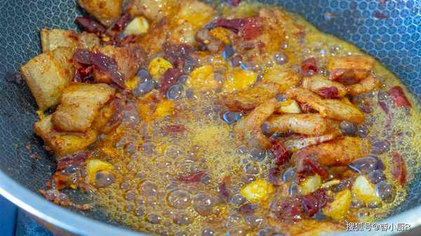 8、用鍋裡的底油來炒五花肉,把五花肉裡面的油脂都煸炒出來,然後加薑蒜幹辣椒爆香,再來一勺豆瓣醬炒出紅油。