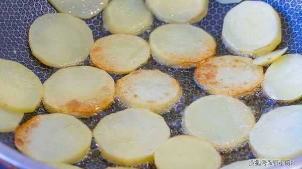 6、起鍋熱油,倒入土豆片,煎至一面金黃翻另一面。