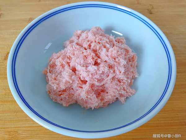 2、做肉餡兒的豬肉建議用豬腿肉,二肥八瘦的口感油潤不柴,吃起來更香。先切成小塊兒,再丟到絞肉機裡面攪打成細膩的肉泥,然後倒出來裝入碗裡。