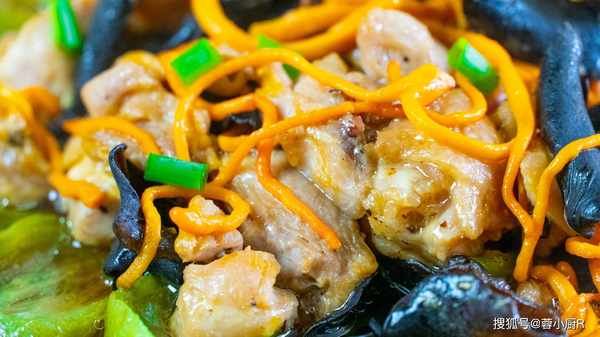 9、晾幹水分的蟲草菇直接倒入雞肉裡面,再把泡好的木耳也倒進來,抓拌均勻後放一旁備用。