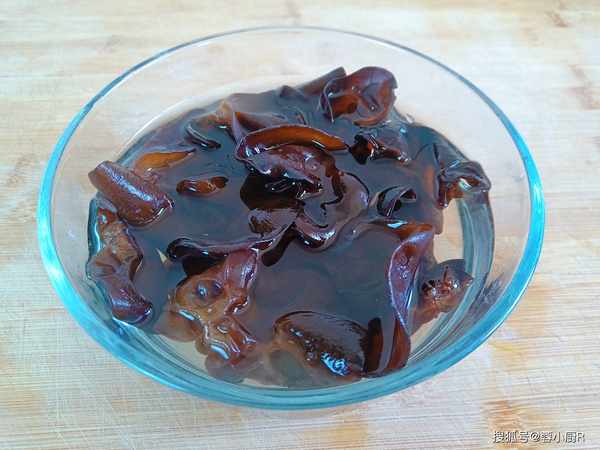 5、黑木耳1把,加一勺鹽和一勺面粉,然後加溫水泡發10分鐘,讓木耳充分的泡發。