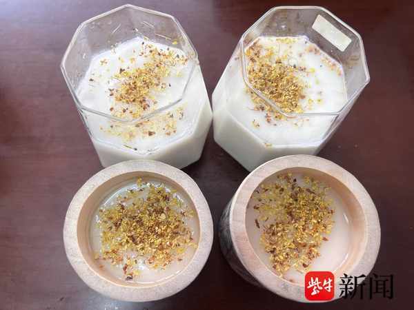 當天上午,於靖提前準備好瞭烏龍茶茶葉、牛奶、桂花糖漿等原材料,然後開始一道道制作工序。記者看到,於靖先用開水將烏龍茶泡開,然後在雪克杯裡倒入冰塊,加入牛奶和果葡糖漿,上下用力搖勻,在玻璃杯中以掛壁的手法加入桂花糖漿,最後把牛奶和茶倒入杯中,撒上桂花,一杯“金桂烏龍奶茶”就制作完成瞭!看到網紅竹筒奶茶很受歡迎,於靖也買來兩個竹筒,奶茶儀式感也被完美復刻。