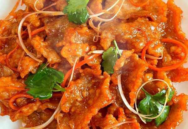 5、蔥絲、香菜絲、胡蘿卜切絲,熱鍋下油燒熱。油熱後,倒入調好的醬汁煮至冒泡,然後加入蔥花、香菜和胡蘿卜,分幾塊炒。然後倒入脆皮肉翻炒均勻。塗上醬汁後,即可出鍋食用。