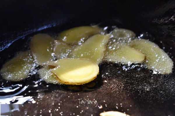 02. 鍋中置少量油,燒熱後加入薑片。可以儘量的多些,先來炒制羊肉去除羊膻。