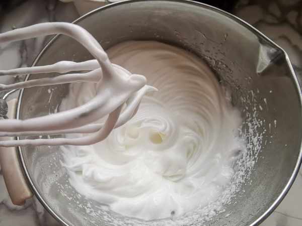 第六步:把蛋白霜分3次放到蛋黃糊中,翻拌均勻。