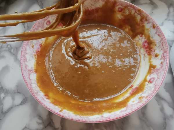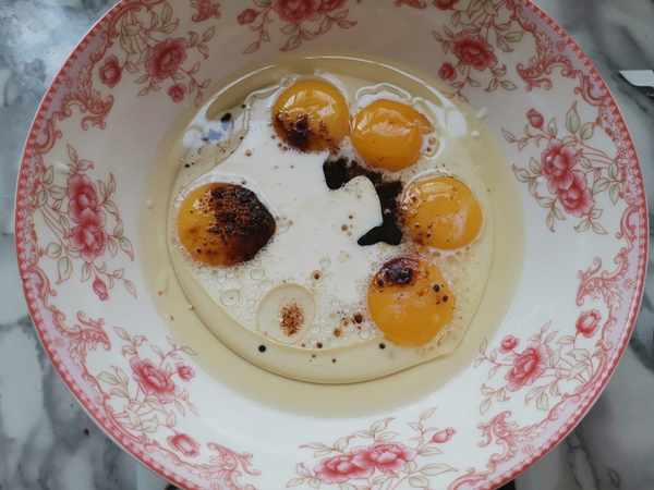 第二步:蛋黃中,加入牛奶,玉米油,紅糖,用蛋抽攪打均勻。