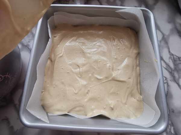第八步:把學廚方形模具中鋪上烘焙油紙,蛋糕糊倒入,震幾下,把蛋糊中的大氣泡震出。