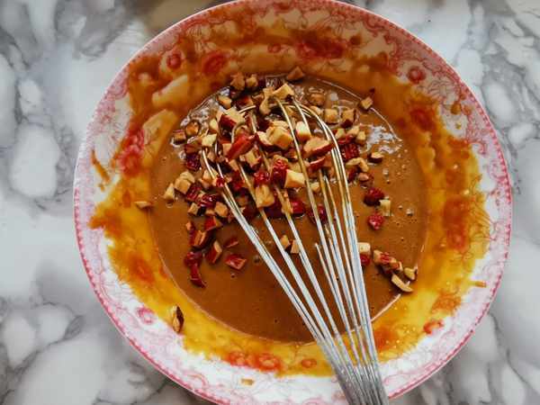 第四步:把去核剪成小丁的紅棗放入,拌勻後備用。