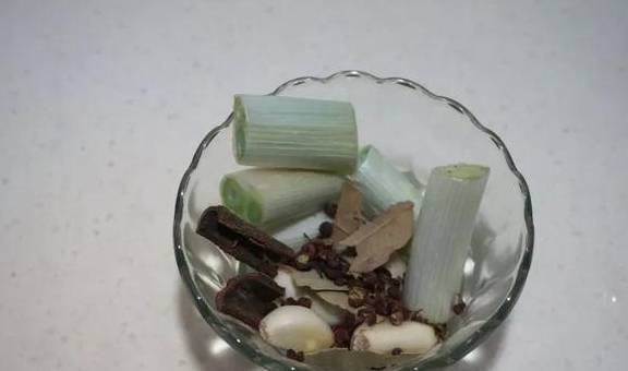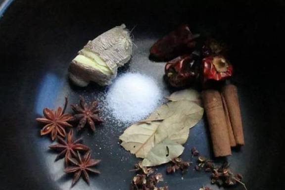 3.備一份煮肉料:八角4個、花椒30粒、桂皮2段,幹辣椒4個,香葉5片,薑一塊,鹽10克。