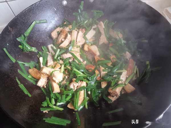放入韭菜煸炒均勻,撒上少許清水,加入適量的鹽翻炒均勻,即可出鍋。