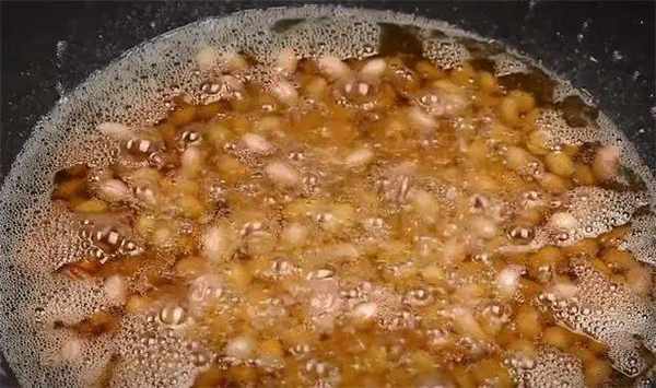 3.然後進入第二階段,會看到很多的小沸點,就是這個狀態,是由於鍋中的熱油排斥花生米中的水分形成的小沸點,這樣慢慢的就把花生米的水分給去除瞭,大約需要3分鐘左右的時間。