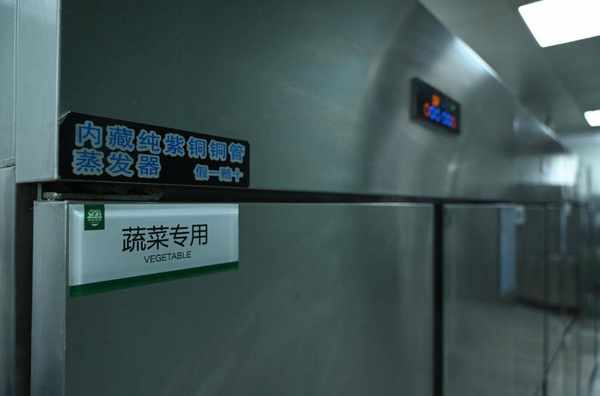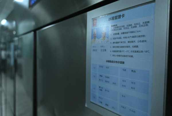 廚房內的各個冰櫃的顯眼位置也備註瞭蔬菜、半成品、肉類等標識,後廚工作人員表示,店內需要冷藏或冷凍的原材料都要按照規定的位置分類存放。