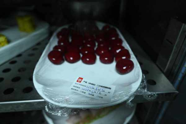 在後廚冷餐間,冰箱內儲存的半成品原材料都有封膜冷藏,而且每個產品還備註瞭加工/開封日期和保質期以及儲存條件。